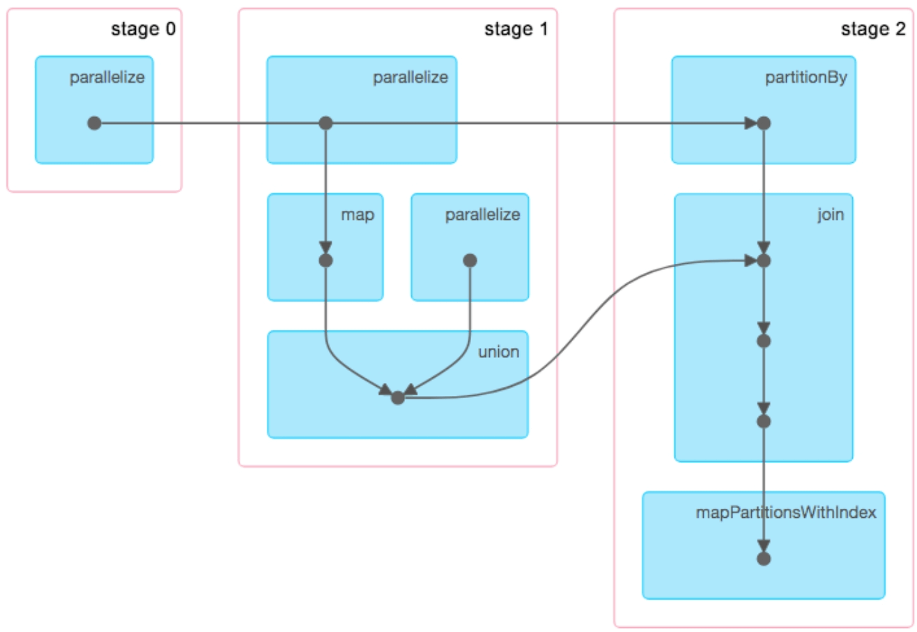 如图4.3中粗箭头所示,在stage 2中,每个task负责ShuffledRDD=>CoGroupedRDD=>MapPartitionsRDD=>MapPartitionsRDD中一个分区的计算。