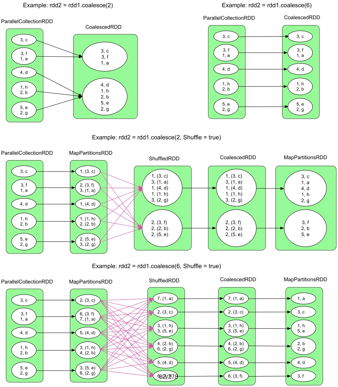 使用Shuffle=true后,Spark可以随机将数据打乱,从而使得生成的RDD中每个分区中的数据比较均衡。具体采用的方法是为rdd1中的每个record添加一个特殊的Key,如第3个图中的MapPartitionsRDD,Key是Int类型,并从[0,numPartitions)中随机生成,如<3,f> => <2,(3,f)>;中,2是随机生成的Key,接下来的record的Key递增1,如<1,a> => <3,(1,a)>。这样,Spark可以根据Key的Hash值将rdd1中的数据分发到rdd2的不同的分区中,然后去掉Key即可(见最后的MapPartitionsRDD)。