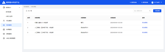 支持取消关联至班级的课程,点击右侧的【取消课程】将取消该课程与该班级的关联,并一并取消与授课教师和参与学生的关联。