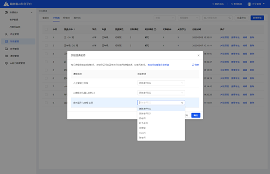 从左侧选择该学校的课程,关联至对应的班级,该班级的教师和学生方可使用该课程进行教与学。