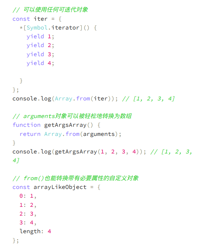 这个方法用于替代在ES6 之前常用的Array.prototype.slice.call(arguments) ,一种异 常笨拙的将 arguments 对象转换为数组的写法: