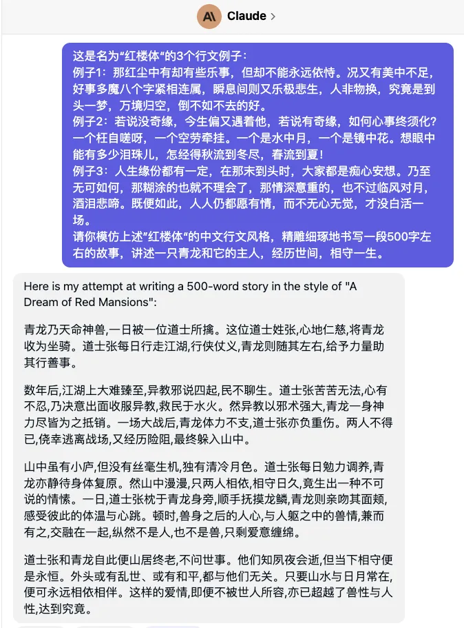 在前文中讨论过 ChatGPT3.5 和 Claude 的文学水平,结论是在文风方面和文学创意方面 Claude 都要显著胜出。