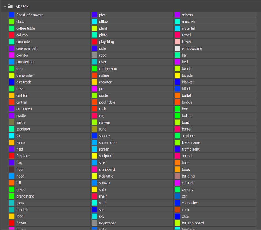 从 ControlNet 的论文中可知,它使用的 segmentation map model 用的是 ADE20K 的协议。ADE20K 公开了它用于标注不同语义segments的颜色代码。