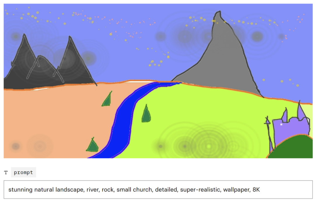 这就意味着在设计 Segmentation map 引导图时,创作者可以反过来用。比如 改变某个 segment 的颜色,使之与 ADE20K 算法用于标注时的语义一致,比如 ADE20K 用于标注“钟表”的是草绿色,把背景那个形状块涂成草绿色,生成时,这个形状块就更大概率会被引导向生成钟表,其实该形状块与钟表常见的圆形形状不符。