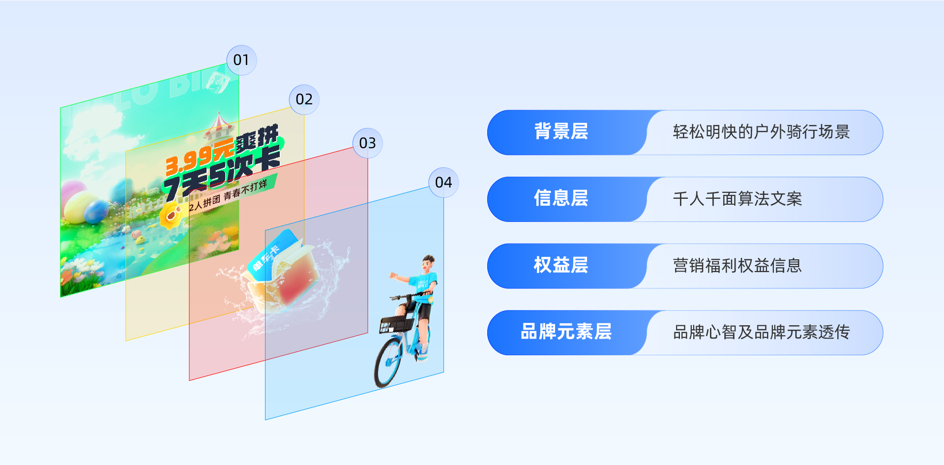 品牌元素层:品牌元素是哈啰骑行重要的品牌设计资产,通过结合以往沉淀的品牌素材,利用Stable Diffusion的特定lora模型训练,丰富品牌资产;