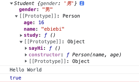 // 子类function Student(gender) {this.gender = gender;}// Student.prototype = PersonInstance;Student.prototype = new Person('ebiebi', 16); // 核心代码Student.prototype.study = function () { console.log('学习中。。。') }const StudentInstance = new Student('男');console.log(StudentInstance);StudentInstance.sayHi(); // Hello World// instanceof 判断元素是否在另一个元素的原型链上// StudentInstance 继承了Person的属性,返回trueconsole.log(StudentInstance instanceof Person); // true