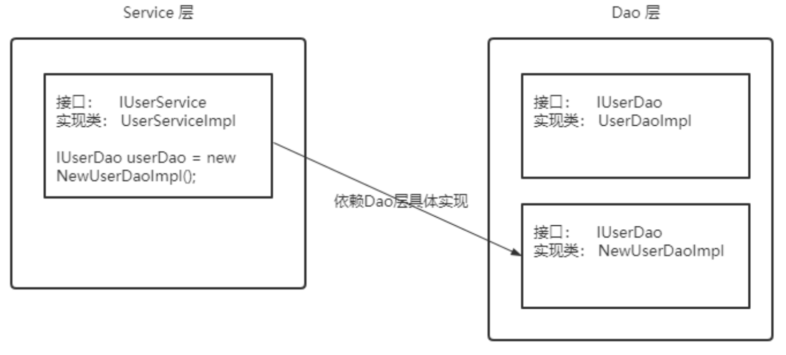 开发过程中突然接到一个新的需求,针对对IUserDao 接口开发出另一个具体实现类。因为 Server 层依赖了IUserDao的具体实现,所以我们需要修改UserServiceImpl中 new 的对象。如果只有一个类引用了IUserDao的具体实现,可能觉得还好,修改起来也不是很费力气,但是如果有许许多多的地方都引用了IUserDao的具体实现的话,一旦需要更换IUserDao 的实现方式,那修改起来将会非常的头疼。