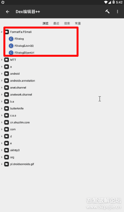 打开dex文件后,我们弹窗的代码就在的红色框这三个类名文件里