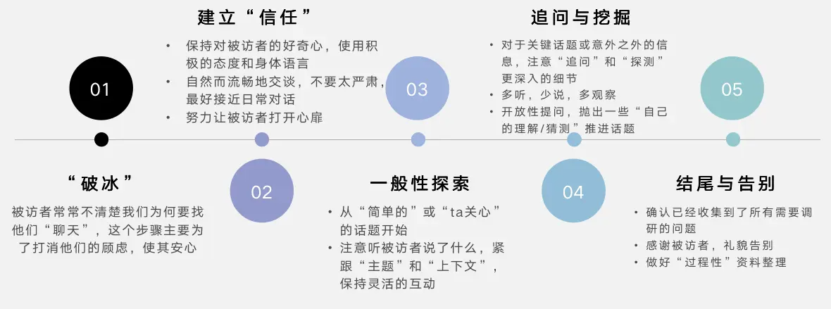 - 专注于被采访者所说的话,时刻保持准备深挖。