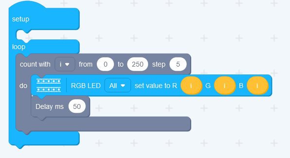 Let’s use first block with for loop to make Bittle slowly light up RGB LEDs.