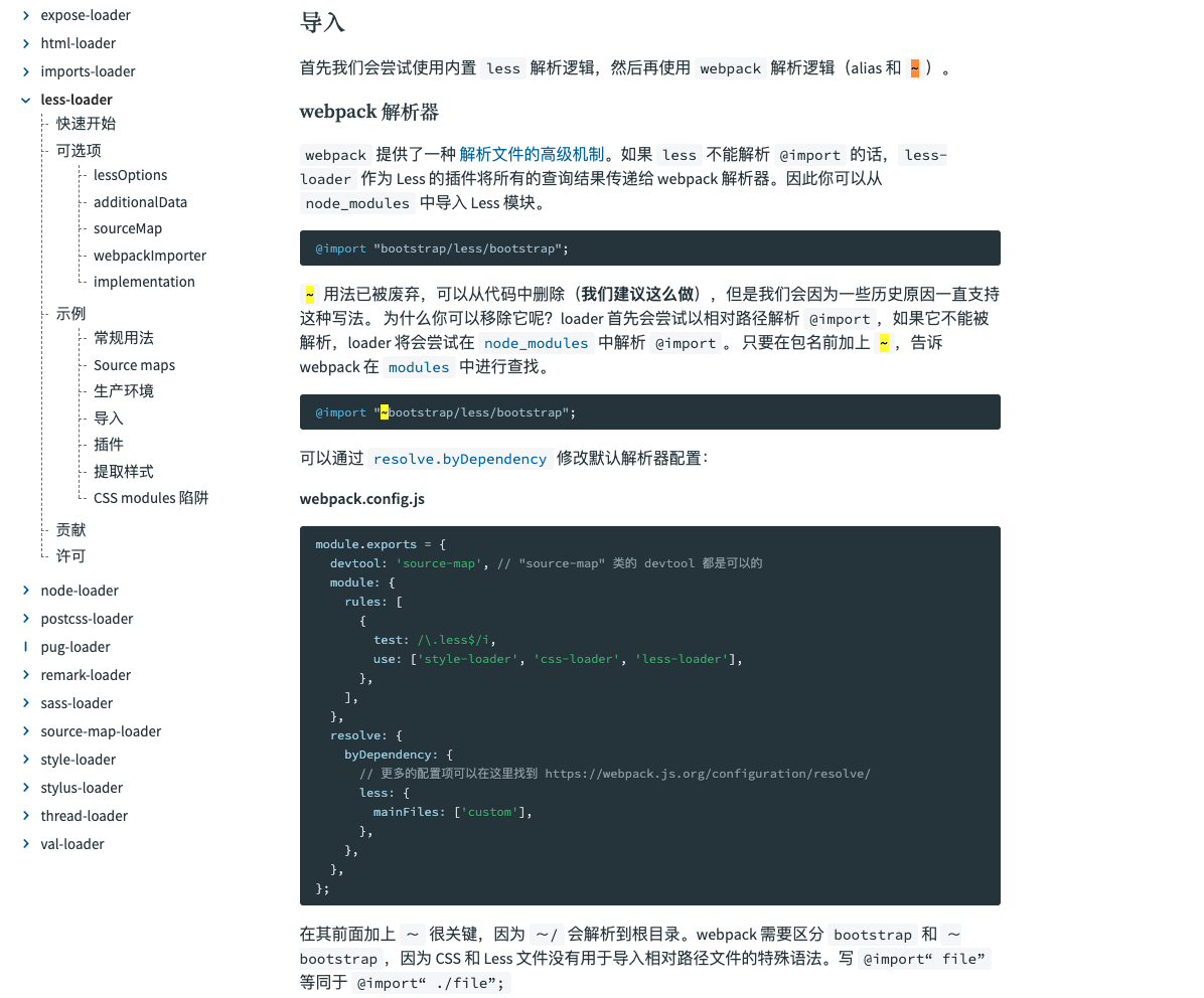 在其前面加上 〜 很关键,因为 〜/ 会解析到根目录。webpack 需要区分 bootstrap 和 〜bootstrap,因为 CSS 和 Less 文件没有用于导入相对路径文件的特殊语法。写 @import“ file” 等同于 @import“ ./file”;