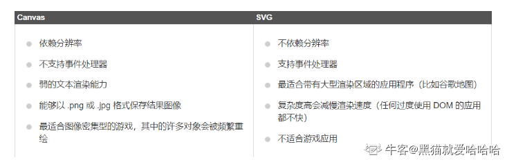 /以上源自知乎/ 1.历史:canvas是html5提供的新元素。 而svg存在的历史要比canvas久远,已经有十几年了。svg并不是html5专有的标签,最初svg是用xml技术(超文本扩展语言,可以自定义标签或属性)描述二维图形的语言。2.功能: canvas可以看做是一个画布,其绘制出来的图形为标量图。可以在canvas中引入jpg或png这类格式的图片。在实际开发中,大型的网络游戏都是用canvas画布做出来的,并且canvas的技术现在已经相当的成熟。另外,我们喜欢用canvas来做一些统计用的图表,如柱状图曲线图或饼状图等。 而svg,所绘制的图形为矢量图,不能引入普通的图片,因为矢量图的不会失真的特点,在项目中我们会用来做一些动态的小图标。这个特点也很适合被用来做地图,百度地图就是用svg技术做出来的。 3.技术: canvas里面绘制的图形不能被引擎抓取,canvas中我们绘制图形通常是通过javascript来实现。 而svg里面的图形可以被引擎抓取,支持事件的绑定,svg更多的是通过标签来实现。我再来介绍一个svg的js库:TWO.JS。其中包含two.js和three.js前者用于绘制二维图形,后者用于绘制三维图形。TWO.JS可以支持三种格式,svg(默认)、canvas、和WEBGL。当然也可以在普通div中引入。 canvas通过js生成,不能被引擎抓取 svg通过标签实现,能被引擎抓取, 优化seo的话要后台传数据 链接:https://www.nowcoder.com/questionTerminal/9d335facf6924598adf8c5983ec42b7a 1.<!DOCTYPE> 声明位于文档中的最前面,处于 标签之前。告知浏览器的解析器,用什么文档类型 规范来解析这个文档。 链接:https://www.nowcoder.com/questionTerminal/9d335facf6924598adf8c5983ec42b7a 文档类型DOCTYPE 当前有两种风格,严格( strict )和过渡( transitional )。过渡 DOCTYPE 的目的是帮助开发人员从老版本迁移到新版本。 如果发送具有正确的 MIME 类型的 XHTML 文档,理解 XML 的浏览器将不显示无效的页面。 浏览器模式DOCTYPE 切换对于 HTML 4.01 文档,