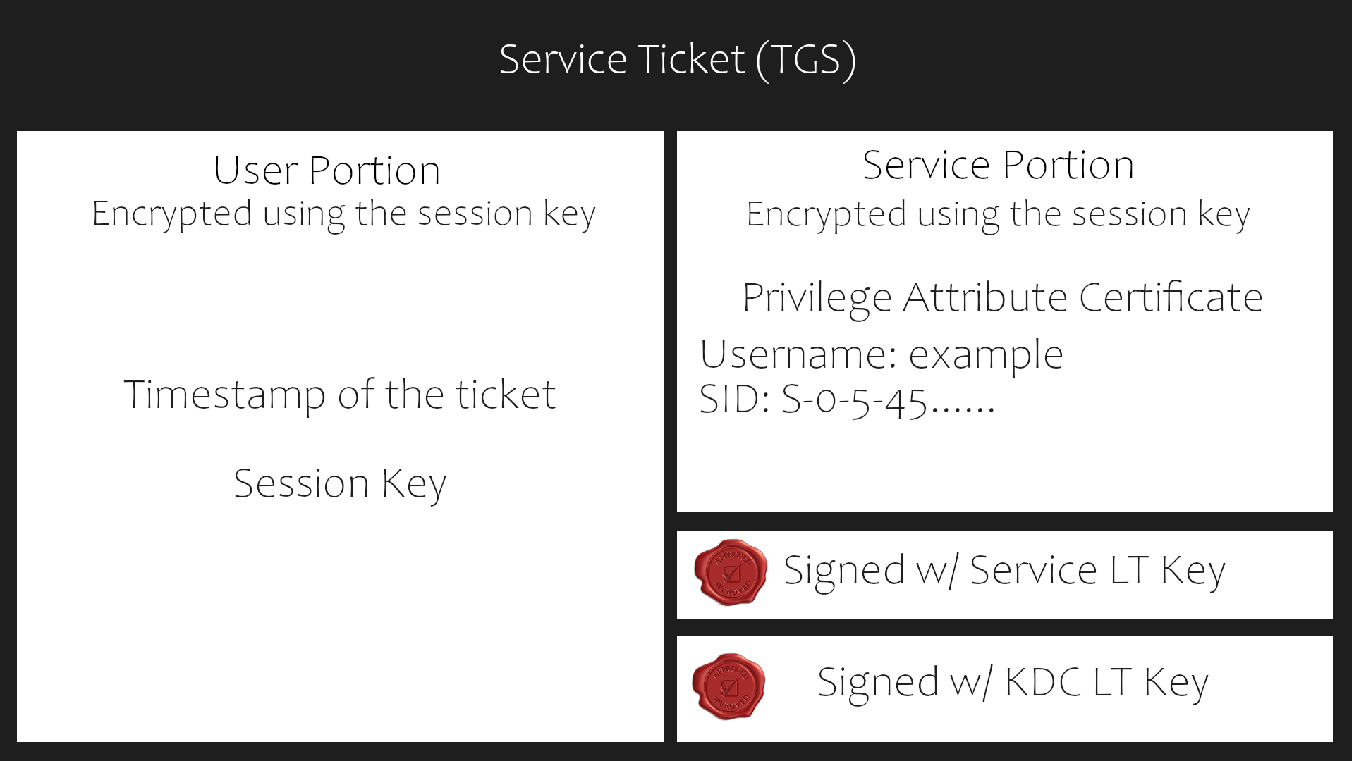 要了解 Kerberos 身份验证的工作原理,您首先需要了解这些票证包含什么以及如何验证它们。服务票据包含两部分:服务提供部分和用户提供部分。我会把它分解成每个部分包含的内容。