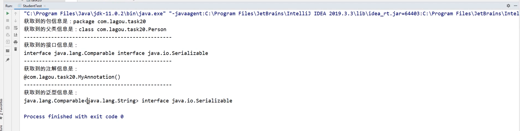 package com.lagou.task20;import java.lang.annotation.Annotation;import java.lang.reflect.Type;public class StudentTest {public static void main(String[] args) throws Exception {// 获取Student类型的Class对象Class c1 = Class.forName("com.lagou.task20.Student");System.out.println("获取到的包信息是:" + c1.getPackage());System.out.println("获取到的父类信息是:" + c1.getSuperclass());System.out.println("-------------------------------------------------");System.out.println("获取到的接口信息是:");Class[] interfaces = c1.getInterfaces();for (Class ct : interfaces) {System.out.print(ct + " ");}System.out.println();System.out.println("-------------------------------------------------");System.out.println("获取到的注解信息是:");Annotation[] annotations = c1.getAnnotations();for (Annotation at : annotations) {System.out.print(at + " ");}System.out.println();System.out.println("-------------------------------------------------");System.out.println("获取到的泛型信息是:");Type[] genericInterfaces = c1.getGenericInterfaces();for (Type tt : genericInterfaces) {System.out.print(tt + " ");}System.out.println();}}