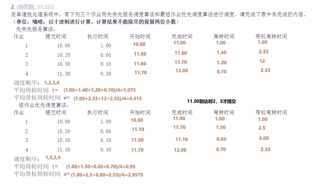 - 14. (其它, 7.8分)设有4道作业,它们的提交时间及执行时间如下:试计算在单道程序环境下,采用先来先服务调度算法和最短作业优先调度算法时的平均周转时间和平均带权周转时间,并指出它们的调度顺序。(时间单位:小时,以十进制进行计算。)