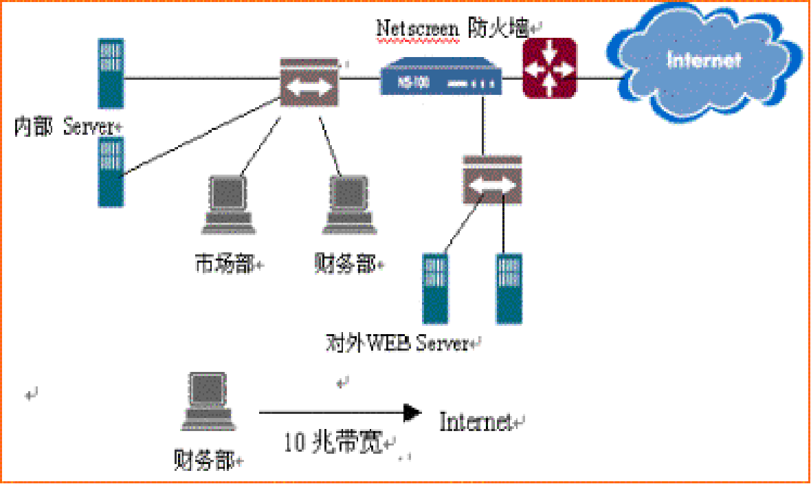 流量控制: 假设实际带宽为100兆,可以在防火墙上定义市场部访问Internet的带宽为20兆,财务部访问Internet的带宽为10兆。也可为Internet 访问公司对外的WEB服务器分配带宽。