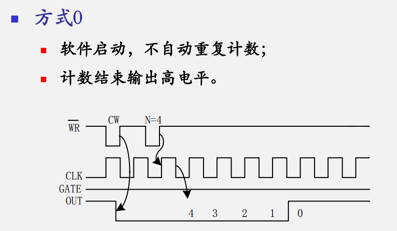 - 其输出信号 (高电平),可用于外部可屏蔽中断请求信号,方式 0 也称为计数结束产生中断请求的一种工作方式