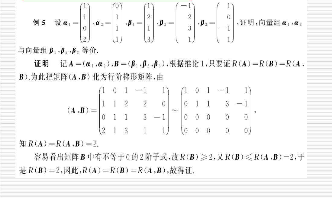 **_向量组的等价_**<br />**定义:设有向量组****/及向量组****.若向量组B中的每个向量都能由向量组A线性表示,则称向量组B能由向量组A线性表示.**<br />**若向量组A与向量组B能互相线性表示,则称这两个向量组等价.若向量组A与向量组B能互相线性表示,则称这两个向量组等价.**