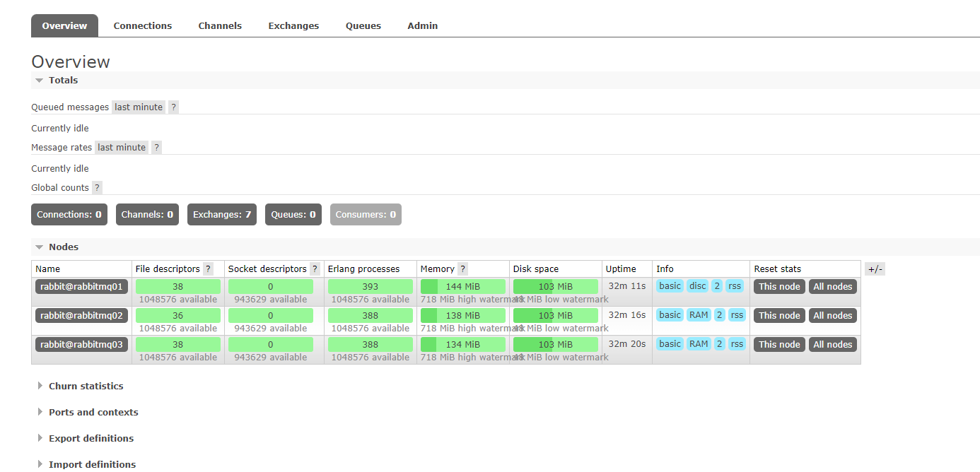 部署好三个rabbitmq我们直接访问主机IP+端口即可看到,reabbitMq的web页面。【提前关闭防火墙/开放端口】