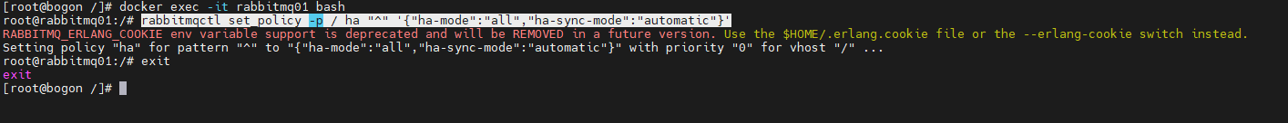 # 进入容器docker exec -it rabbitmq01 bash# 执行策略命令rabbitmqctl set_policy -p / ha "^" '{"ha-mode":"all","ha-sync-mode":"automatic"}'#退出容器exit