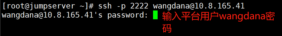 语法: ssh -p 2222 平台用户@堡垒机IP# ssh -p 2222 wangdana@10.8.165.41