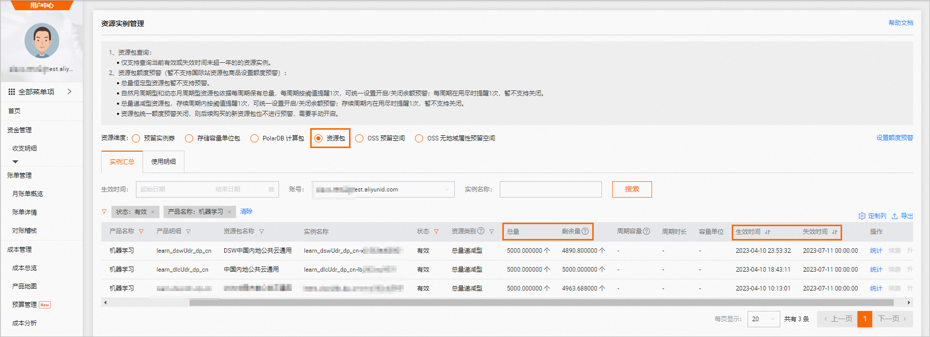 - 免费额度用尽或超出试用期:领取免费资源包后,请在免费额度和有效试用期内使用。如果免费额度用尽或试用期结束后,若继续使用计算资源,将会产生后付费账单。