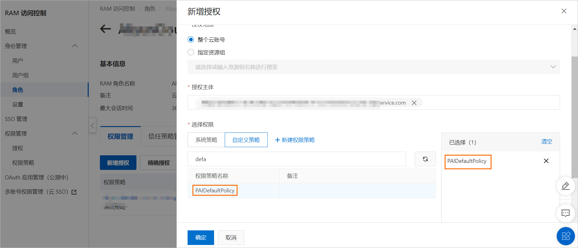 信任策略内容修改为如下脚本内容。 - 配置权限策略。您可以根据角色用户登录后需要使用的子产品需求,为角色用户添加权限策略。未设置权限策略可能会影响您在工作空间中的部分功能(例如:AI资产管理-数据集等)。建议您为角色用户添加相关的权限策略,具体操作步骤如下。