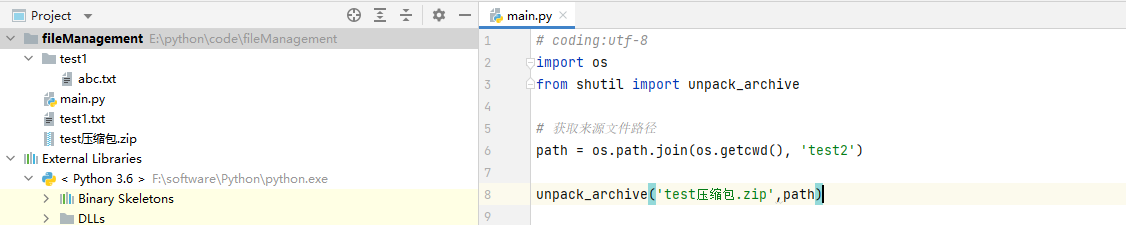 使用方法:unpack_archive(要解压的文件,解压后的路径) 代码演示: