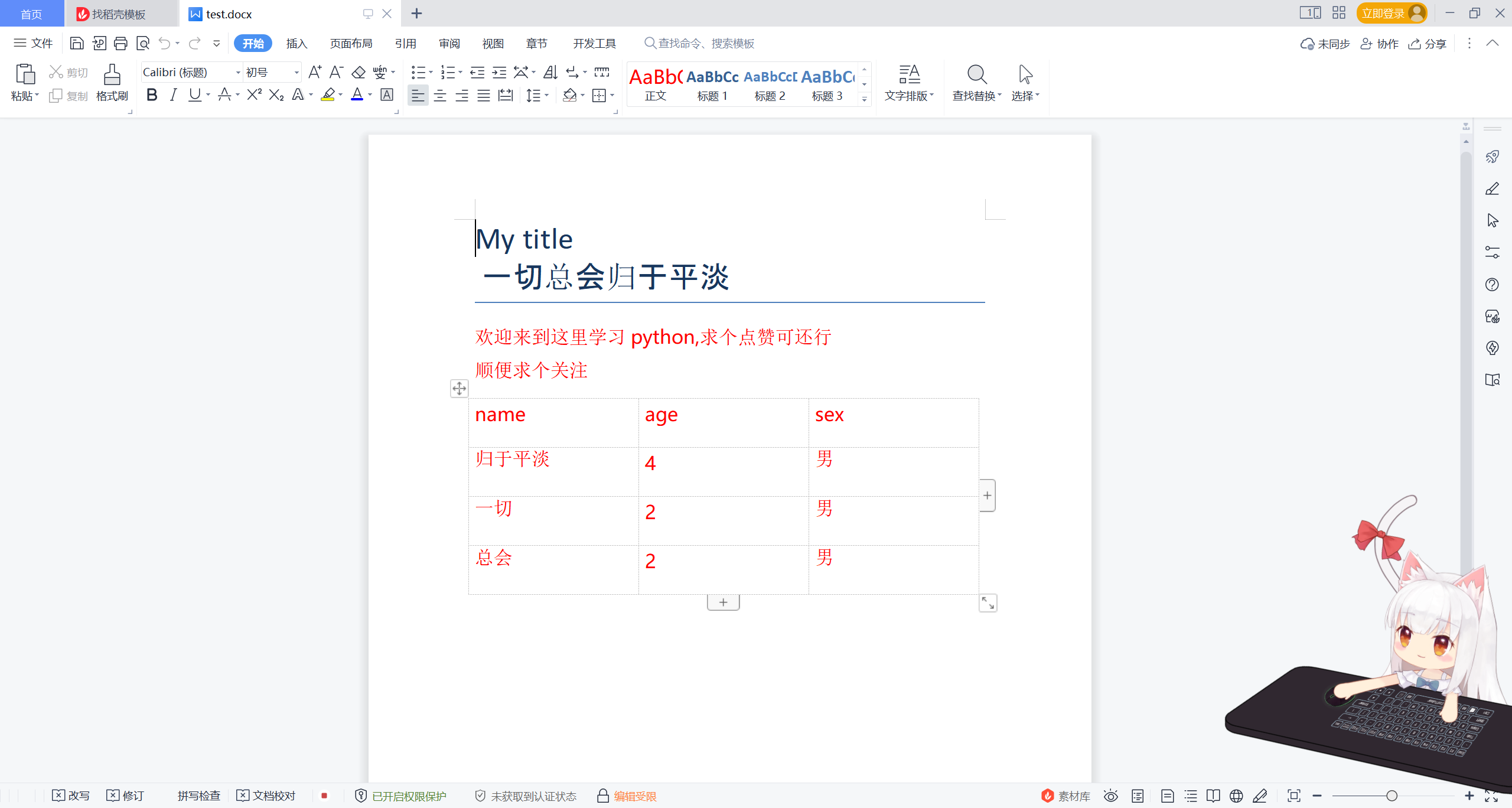 # coding:utf-8from docx import Documentfrom docx.shared import RGBColor, Ptfrom docx.enum.text import WD_PARAGRAPH_ALIGNMENTdoc = Document()# 添加标题 参数 : 标题内容,标题样式等级title = doc.add_heading('My title', 0)# 设置标题居中title.alignment = WD_PARAGRAPH_ALIGNMENT.CENTER# 设置标题字体大小title.style.font.size = Pt(50)# 追加内容_t = title.add_run('\n 一切总会归于平淡')# 设置标题倾斜 最开始的标题设置不了倾斜,只能在追加内容里,如果想要设置,就把最开始的标题设置为 空字符串,然后全都追加内容里写。_t.italic = True# 设置标题加粗_t.bold = True# 添加段落p = doc.add_paragraph('欢迎来到这里学习python,求个点赞可还行')# 追加内容 顺便设置倾斜p.add_run('\n顺便求个关注').italic = True# 设置段落居右p.alignment = WD_PARAGRAPH_ALIGNMENT.RIGHT# 生成 word 文档doc.save('test.docx')