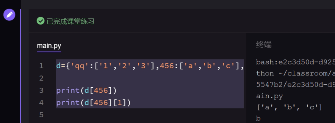 d={‘qq’:[‘1’,’2’,’3’],456:[‘a’,’b’,’c’],’j’:100}