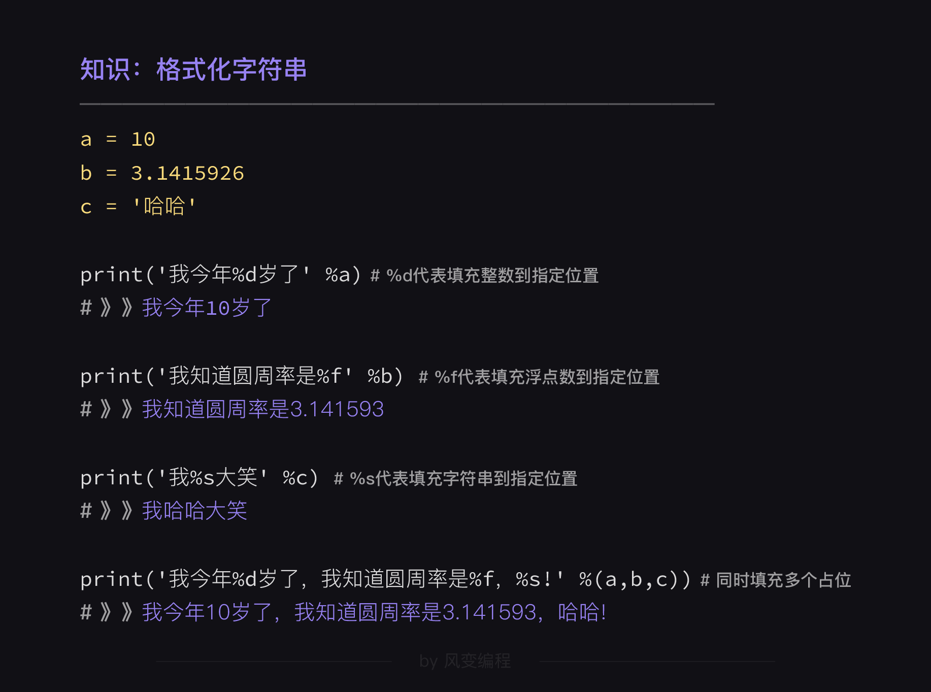 print(‘n,%d,or%f+%sm’%(a,b,c))