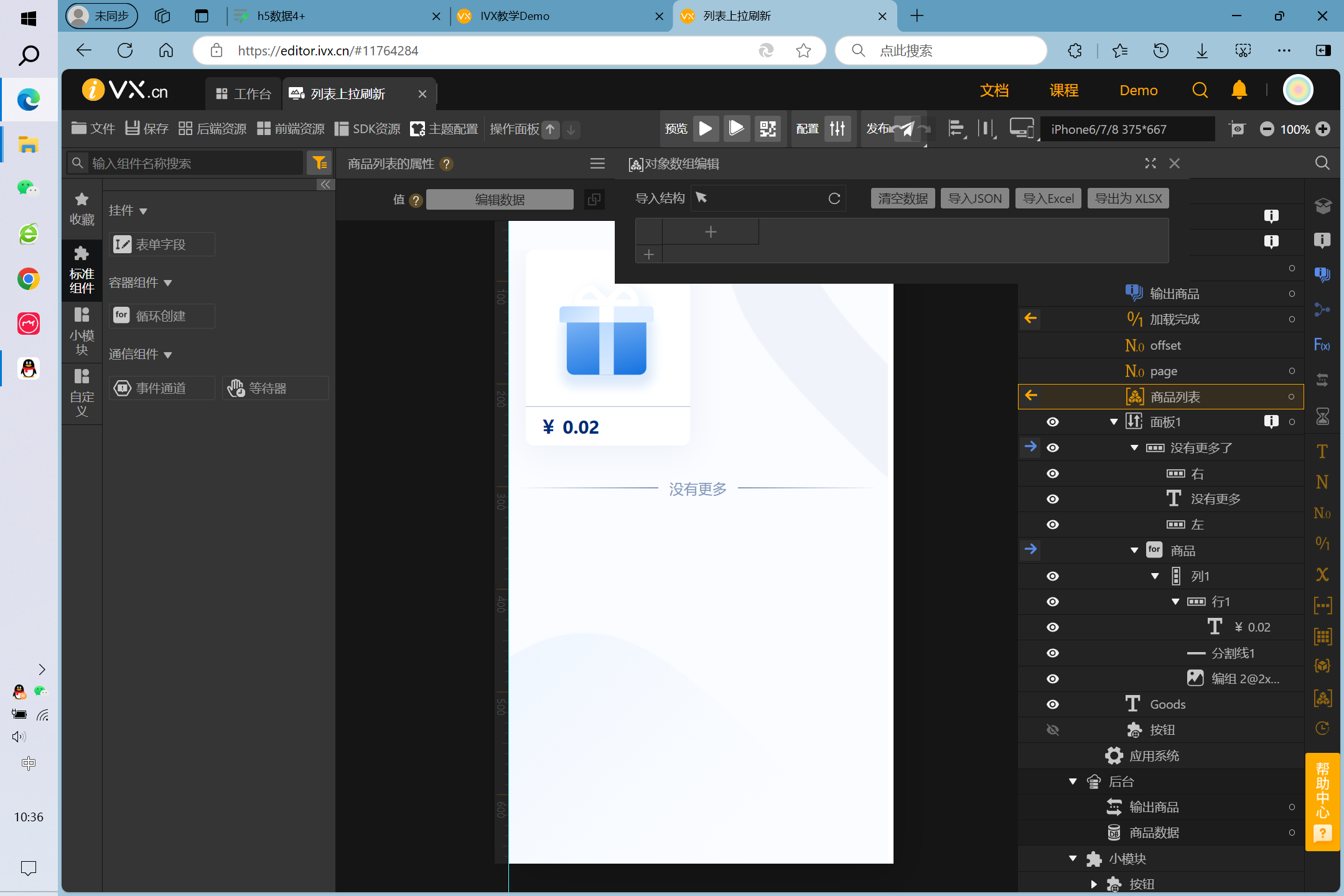注意:由于面板组件不知道数据获取所需要的时间,加载的动画不会自主结束,而需要我们自己在获取数据结束后去手动结束动画。面板文档:https://www.ivx.cn/docview?lang=zh&page=ih5-simscroller&type=doc&showall=0#