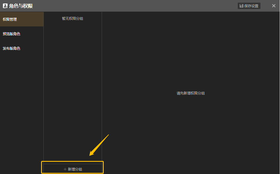 在后台资源-账号系统面板选中一个账号系统,之后点击右侧的【权限与角色】按钮进入配置界面。首先,我们需要先设置权限分组,点击下方【+新增分组】按钮。