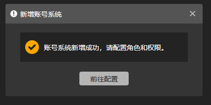 新增成功后,编辑器内会弹窗提示开发者下一步去配置权限和角色,点击【前往配置】即可进入下面的配置权限树和角色操作。如果应用内不涉及权限相关的限制功能,可以点X关闭此弹窗。