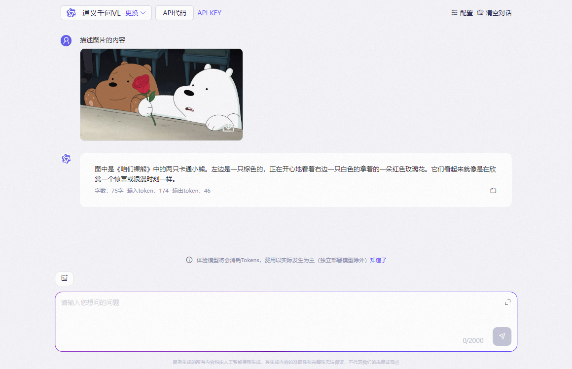 图片识别场景。可以描述上传图片中存在的内容,可以根据图片中存在的场景进行分析描述。