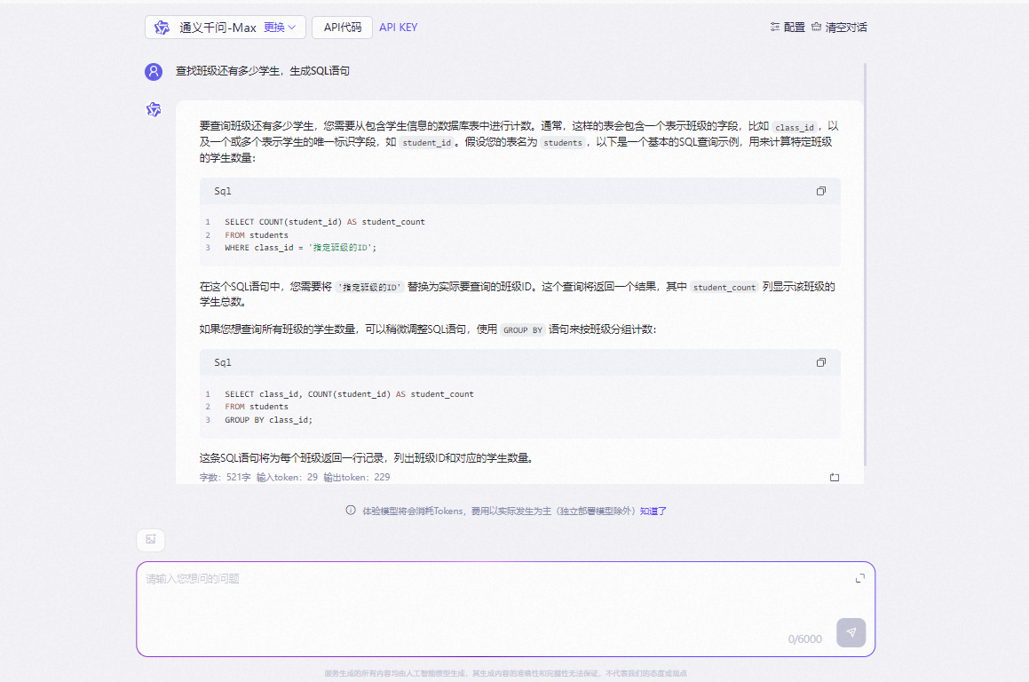 数据查询场景。可以使用prompt模板中的自然语言转SQL查询语句。推荐使用自然语言转SQL大模型。使用案例:用户希望通过大模型实现自然语言转SQL语句。例如:查找班级还有多少学生,生成SQL语句。如下图:
