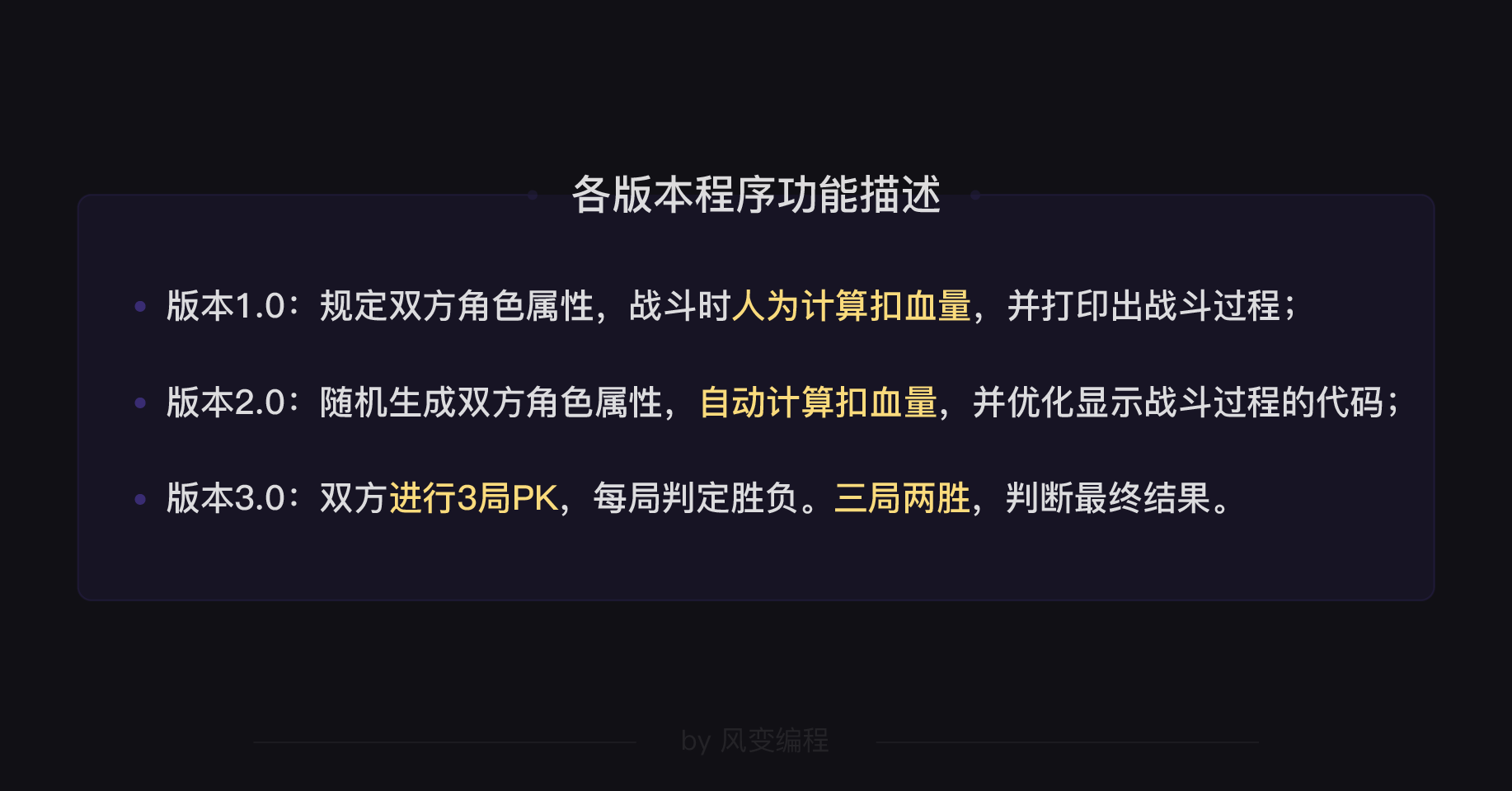 版本1.0,主要是帮我们理清战斗逻辑。而版本2.0和3.0,会涉及到一些新的知识点,到时遇到了再和大家介绍。