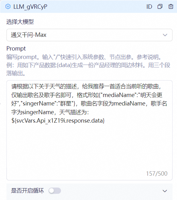 示例Prompt:请根据以下关于天气的描述,给我推荐一首适合当前听的歌曲,仅输出歌名及歌手名即可,格式形如{“mediaName”:”明天会更好”,”singerName”:”群星”},歌曲名字段为mediaName,歌手名字为singerName,天气描述为:${svcVars.Api_XWndOx.response.data}