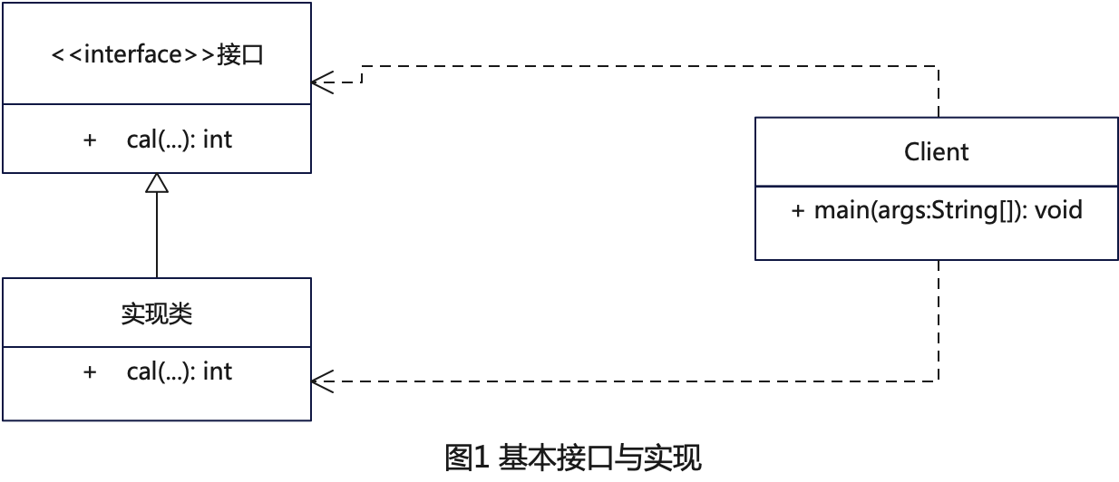 public class Client {public static void main(String[] args) {CalApi calApi = new CalApiImpl();calApi.cal(1, 2, "+");}}