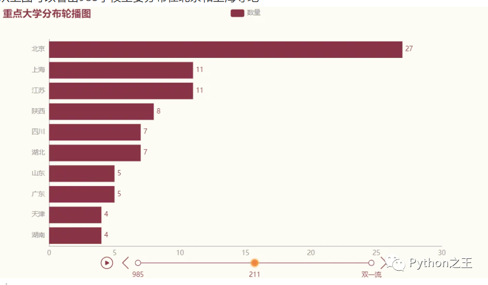 从上面的可视化结果可以看出中国目前高校(大学)的办学状况,包括高校在各个省份的分布、本科和专科占比情况、各个办学类别占比情况、985,211,双一流分布情况,中国开设数量排名前20的热门专业和国家特色专业学校分布等关于高校办学的信息,为报志愿的高考生和想了解这方面信息的人提供信息和参考。本文参与 腾讯云自媒体同步曝光计划,分享自微信公众号。