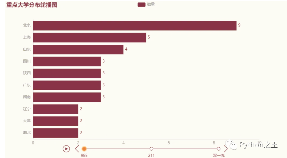 本项目主要使用了学校、省份、水平层次、办学类别、985、211、双一流、专业名称、国家特色专业等数据,通过pandas相关模块对数据进行抽取、清洗和分组统计计算,再而用pyecharts数据可视化模块绘制交互式可视化图表,分析得出各省大学数量分布、本科,专科占比、各办学类别占比、985,211,双一流学校分布、开设数量前二十的专业以及国家特色专业分布等数据结果,旨在结合这些数据分析中国目前高校(大学)办学状况、中国开设数量排名前20的热门专业和国家特色专业主要分布在哪些学校等关于高校办学的信息,为报志愿的高考生和想了解这方面信息的人提供参考。三、数据分析结果价值宣言