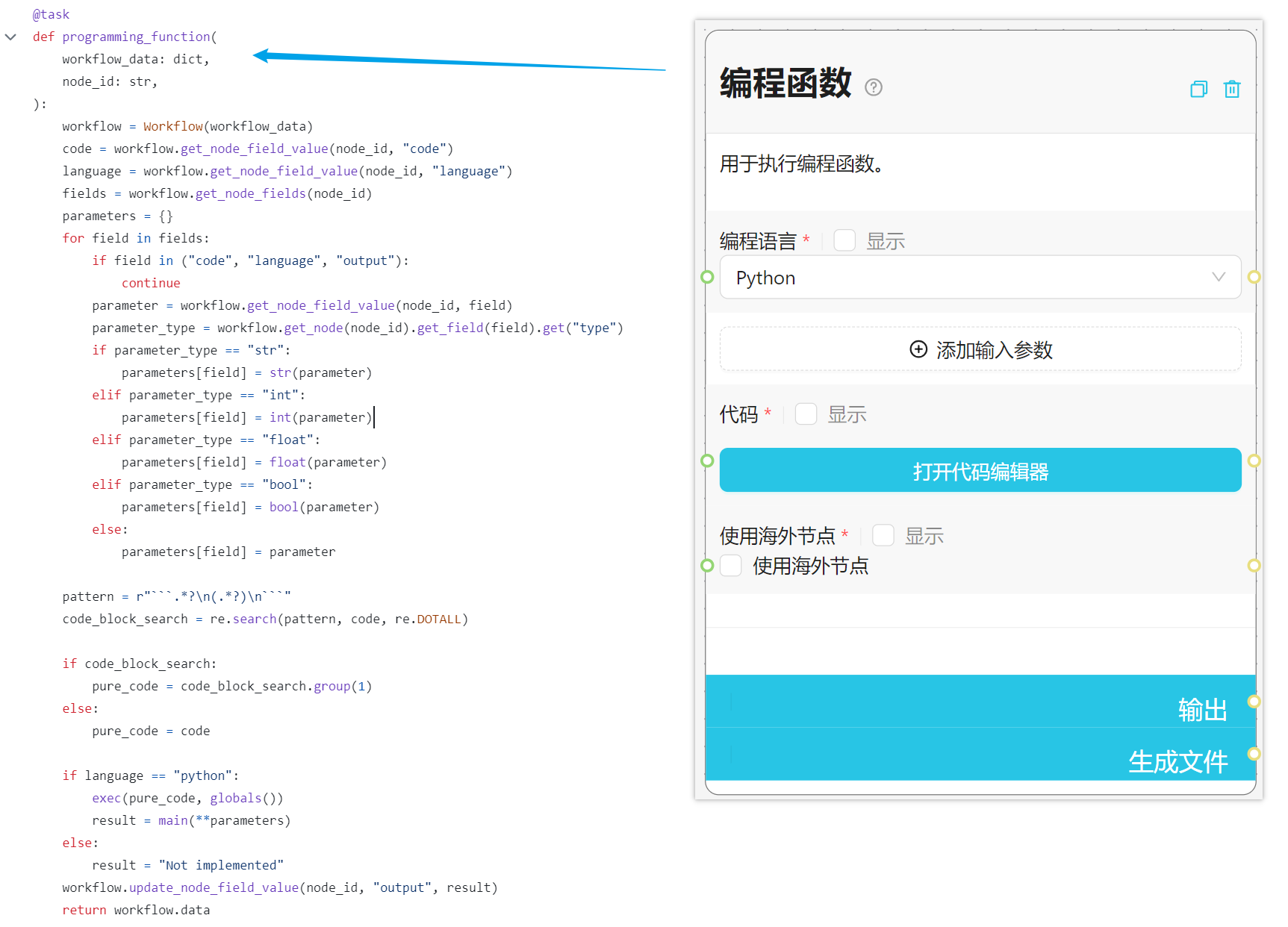 最开始的设计是将【工作流调用】节点视作常规节点,在后端服务器的程序里,它会被当做一个常规节点,由一个函数进行处理,可以类比 backend/worker/tasks/tools.py 中的 <font style="color:rgb(31, 35, 40);">programming_function</font> 函数:
