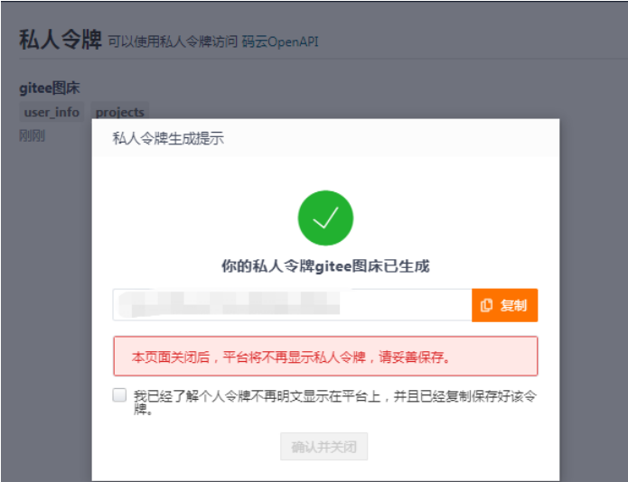 3、生成以后,会出现自己的token,只能生成的时候查看,所以复制下来保存好
