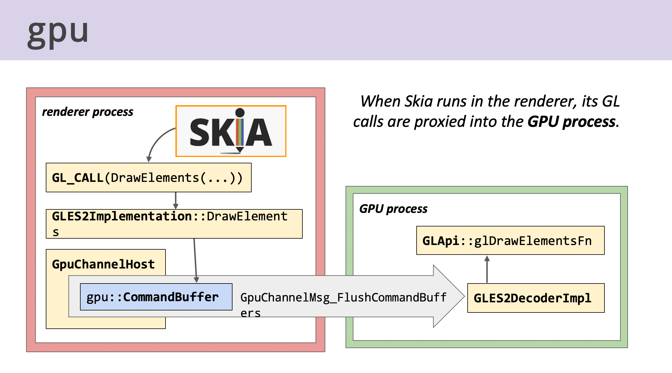 Skia’s GL calls are proxied into the GPU process using command buffer.So the GPU process make the real GL calls.