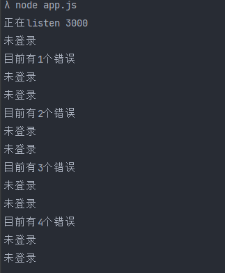 const app = express();app.use((req, res, next) => {res.write('1');next();});app.use((req, res, next) => {res.write('2222');if (true) {next('未登录');}next();});app.use((req, res, next) => {res.write('3');next();});app.use((error, req, res, next)=> {console.log(error)next(error)})let count = 0app.use((error, req, res, next)=> {count +=1console.log(`目前有${count}个错误`)next(error)})app.listen(3000, () => {console.log('正在listen 3000');});