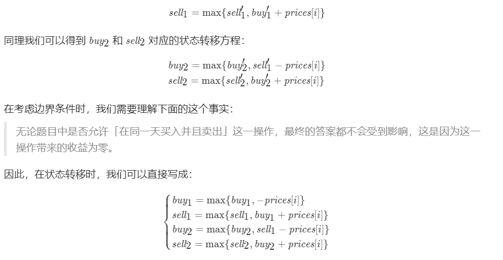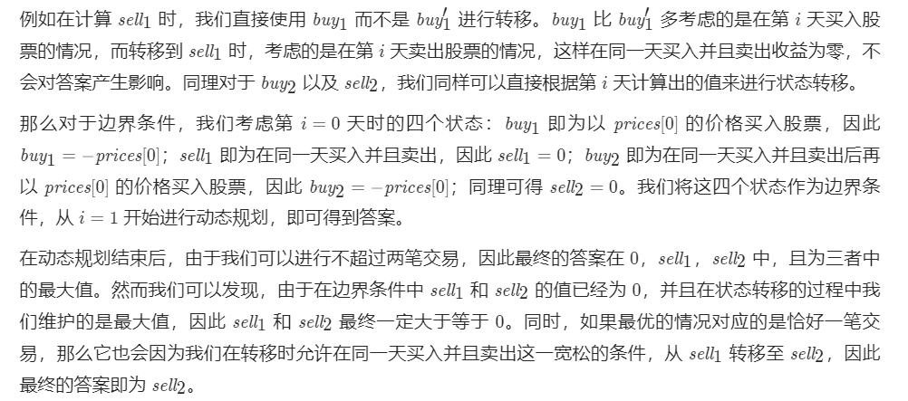 class Solution {public int maxProfit(int[] prices) {int len = prices.length;if(len<=1)return 0;int buy1 = -prices[0];int sell1 = 0;int buy2 = -prices[0];int sell2 = 0;for(int i = 1; i < len; i++) {buy1 = Math.max(-prices[i],buy1);sell1 = Math.max(buy1 + prices[i],sell1);buy2 = Math.max(sell1 - prices[i],buy2);sell2 = Math.max(buy2 + prices[i],sell2);}return Math.max(sell1,sell2);}}