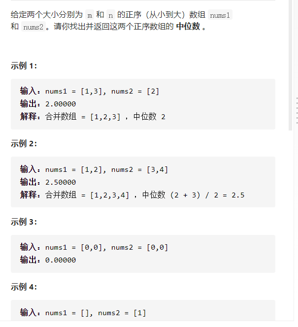 class Solution {public double findMedianSortedArrays(int[] nums1, int[] nums2) {int m = nums1.length; // num1的长度int n = nums2.length; // num2的长度if(m==0) { // 如果其中一个没有数据,只需要返回就可以了if((n&1)==0) { // 第二个是偶数时候,需要找到中间的两个取平均return (nums2[n/2]+nums2[n/2-1])/2.0;} else { // 第二个是奇数长度,return nums2[n/2];}} else if(n==0) {if((m&1)==0) {return (nums1[m/2]+nums1[m/2-1])/2.0;} else {return nums1[m/2];}} else if(n==1 && m==1) {return (nums1[0]+nums2[0])/2.0;}// 两个都是有效数组,需要进行判断int len = m+n;if((len&1)==0) { // 总长度是偶数,需要取两个值int k1 = len/2;int k2 = k1+1;int a = find(nums1,nums2,k1);int b = find(nums1,nums2,k2);return (a+b)/2.0;} else{ // 总长度是奇数,只需要取一个值就可以了int k = len / 2 + 1;return find(nums1,nums2,k)/1.0;}}int find(int[] nums1,int[] nums2,int k){int l1 = 0; // num1的起始位置int l2 = 0;int r1 = nums1.length-1; // num1的结束位置int r2 = nums2.length-1;while(l1<=r1 && l2 <=r2) {int len1 = k/2-1; // num1的有效长度int len2 = k/2-1;if(l1+len1>r1){ // 如果超出边界,按到最右边的长度进行处理len1 = r1-l1;}if(l2+len2>r2) {len2 = r2-l2;}// System.out.println("l1="+l1);// System.out.println("len1="+len1);// System.out.println("l2="+l2);// System.out.println("len2="+len2);// 如果num2的位置k比较小,那么更新num2的起始位置if(nums1[l1+len1]>nums2[l2+len2]) {k-=(len2+1); // 删除nnum2的以判断的长度l2 = l2+len2+1;if(l2>r2) { // num2如果已经没有数据了return nums1[l1+k-1];}} else {k-=(len1+1);l1 = l1+len1+1;if(l1>r1) {return nums2[l2+k-1];}}if(k==1){ // 如果最后两个数组都是长度大与等于1的return Math.min(nums1[l1],nums2[l2]);}}return -1;}}