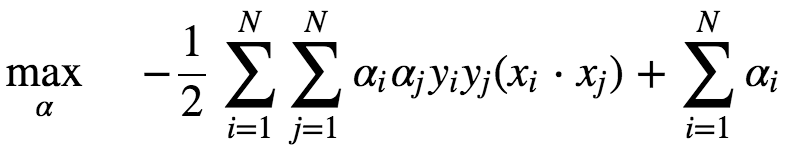 C为调节二者的参数。通过构造拉格朗日函数并求解偏导(具体推导略去),可得到等价的对偶问题: