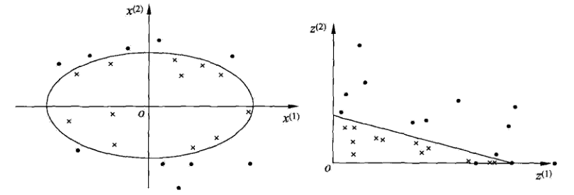 对于非线性问题,线性SVM不再适用了,需要非线性SVM来解决了。解决非线性分类问题的思路,通过空间变换ϕϕ(一般是低维空间映射到高维空间x→ϕ(x)x→ϕ(x))后实现线性可分,在下图所示的例子中,通过空间变换,将左图中的椭圆分离面变换成了右图中直线。