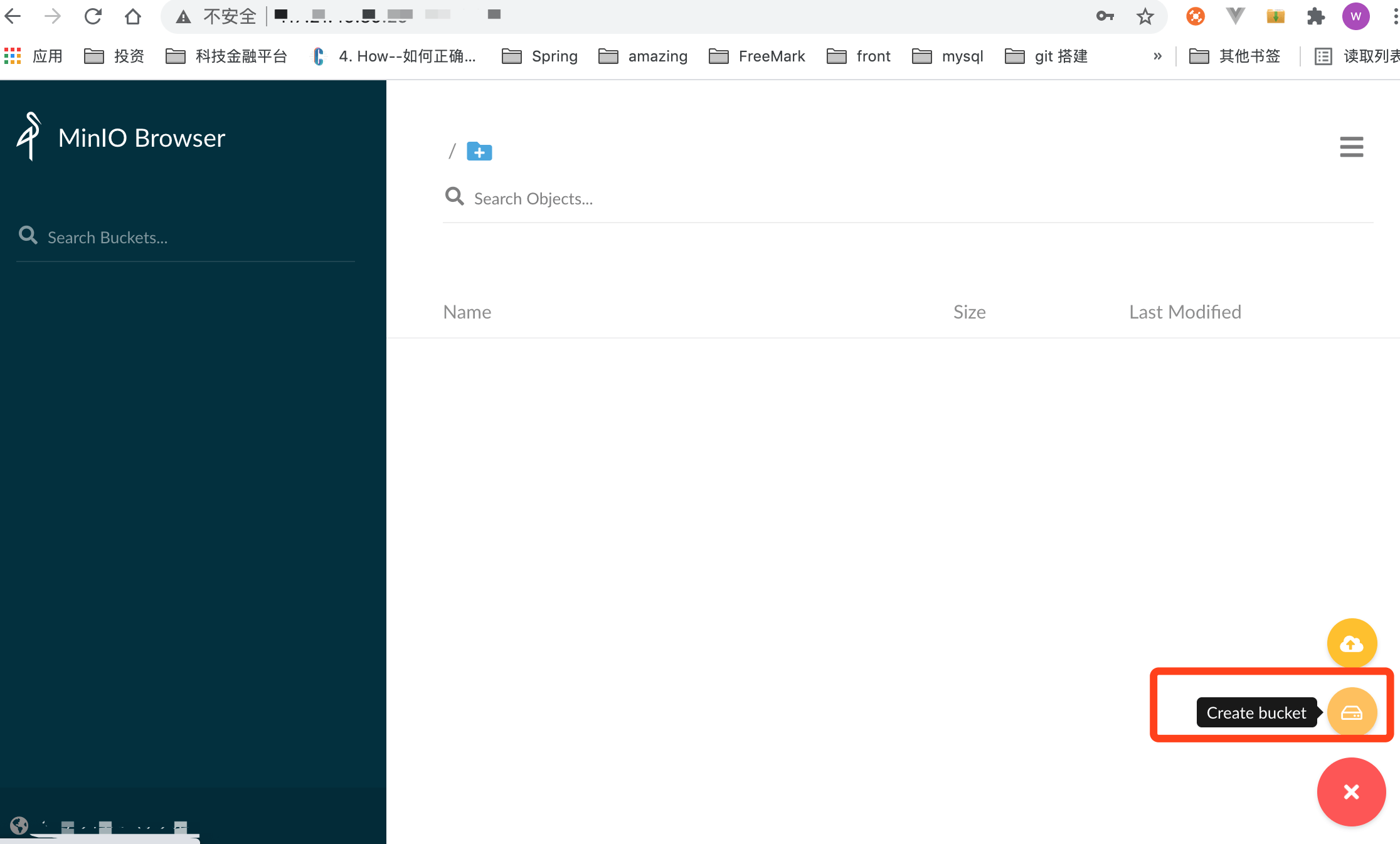 点击MinIO Browser 右下脚的红色的+号操作,选择Create bucket 创建 bucket